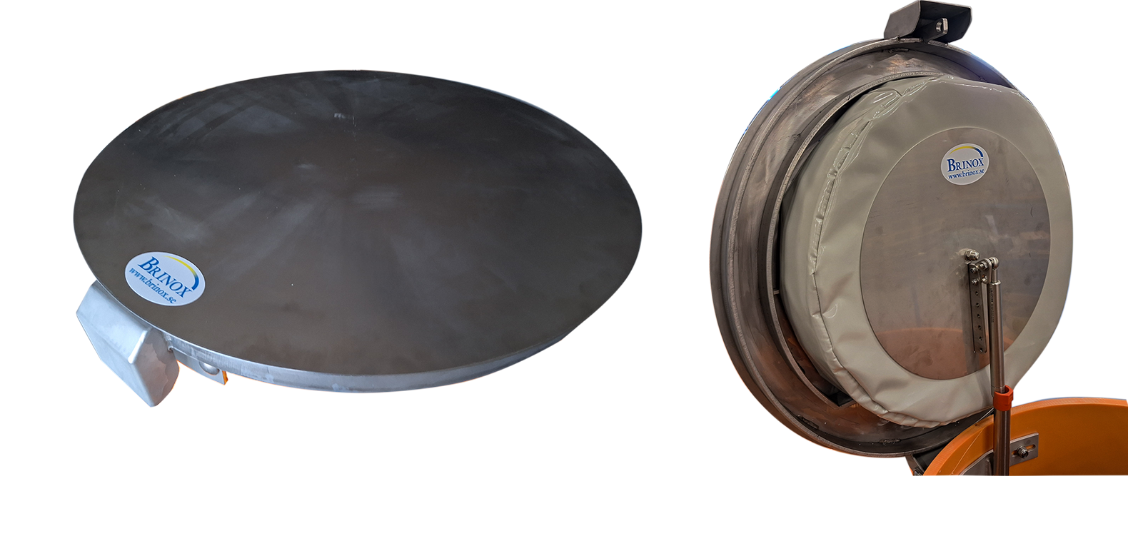 Vårt runda rostfria lock i syrafast stål - utvecklat, designat, och tillverkat i Sverige, för brunnar med inner-dimension 1200